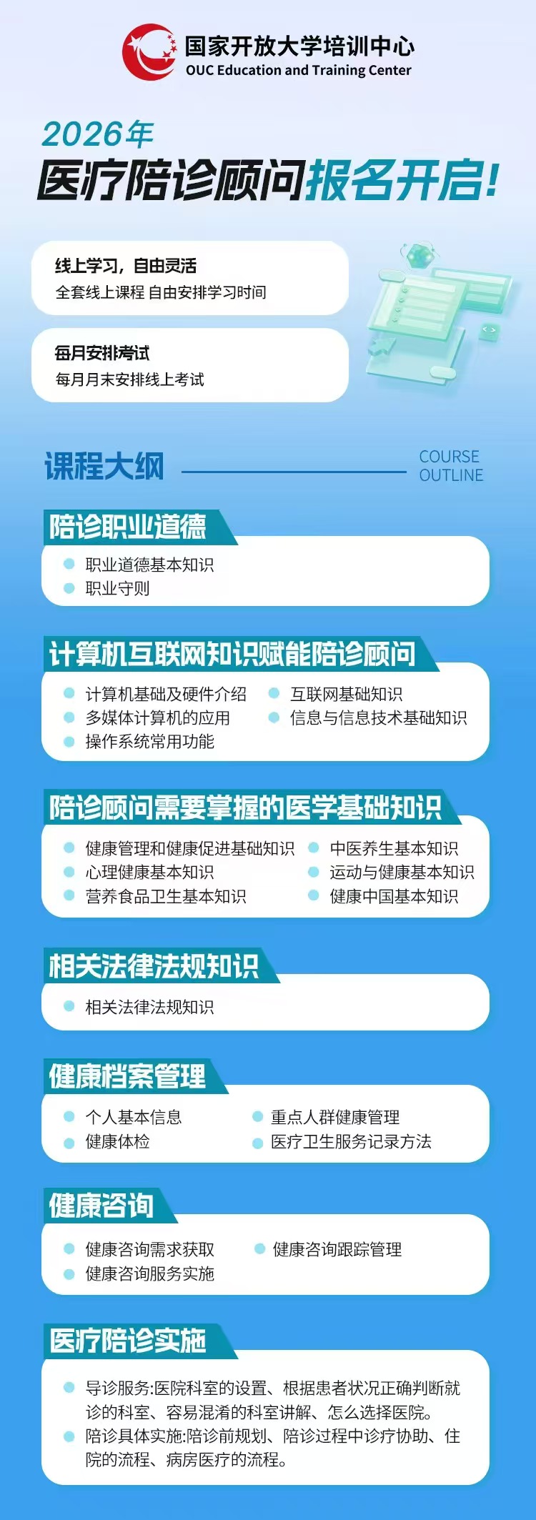 随着老龄化进程加速与“互联网+医疗”的深度融合,医疗陪诊行业迎来爆发式增长,数据显示2026年中国陪诊服务市场规模将突破900亿元,专业陪诊顾问成为刚需热门职业。为深入贯彻落实国务院《国家职业教育改革实施方案》要求,深化产教融合与校企合作,推进医疗陪诊领域职业技能培训及考核认证的规范化、标准化发展,全面提升从业人员专业素养与服务能力,国家开放大学培训中心正式启动“医疗陪诊顾问职业技能培训项目”。